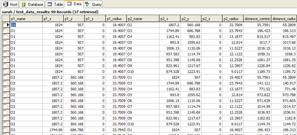 $distance = sqrt( (($p1_x - $p2_x)*($p1_x - $p2_x)) + (($p1_y - $p2_y)*($p1_y - $p2_y)) + (($p1_z - $p2_z)*($p1_z - $p2_z)) ) - ($p1_r + $p2_r);